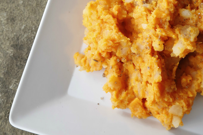 3. Once the potatoes are mashed add the cream, caramelized garlic olive oil, and cumin spice salt. Mix to combine and taste for seasoning, adding more salt to taste. Enjoy!