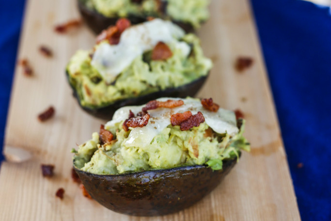 - Add milk, Manchego cheese, and bacon salt and mix thoroughly. Carefully scoop mixture back into avocado skins.
