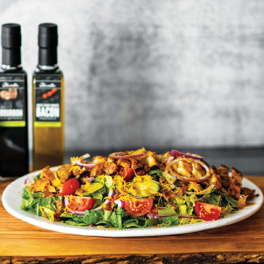 • Add lettuce to a platter, top with tomatoes, cucumbers, red onion, cheese, bacon, and sliced chicken. Drizzle the dressing over and enjoy!