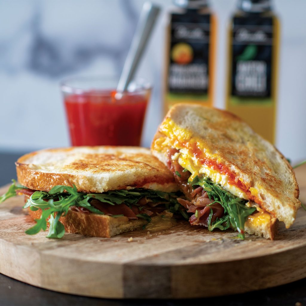 Fried Egg, Prosciutto, and Red Pepper Jam Breakfast Sandwich