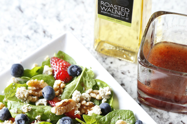 Ingredients: 4 cups Spinach 2 cups Berries (Blueberries& Strawberries) 1/2 cup Walnuts 1/4 cup Blue Cheese crumbled 1/2 cup Roasted Walnut Oil 1/4 cup Vinegar (sweet raspberry or vanilla pomegranate) 2 tsp Honey 1/4 cup Sea Salt (vanilla bean or Himalayan) Instructions: On a platter arrange spinach, berries, walnuts, and blue cheese. Whisk walnut oil, […]